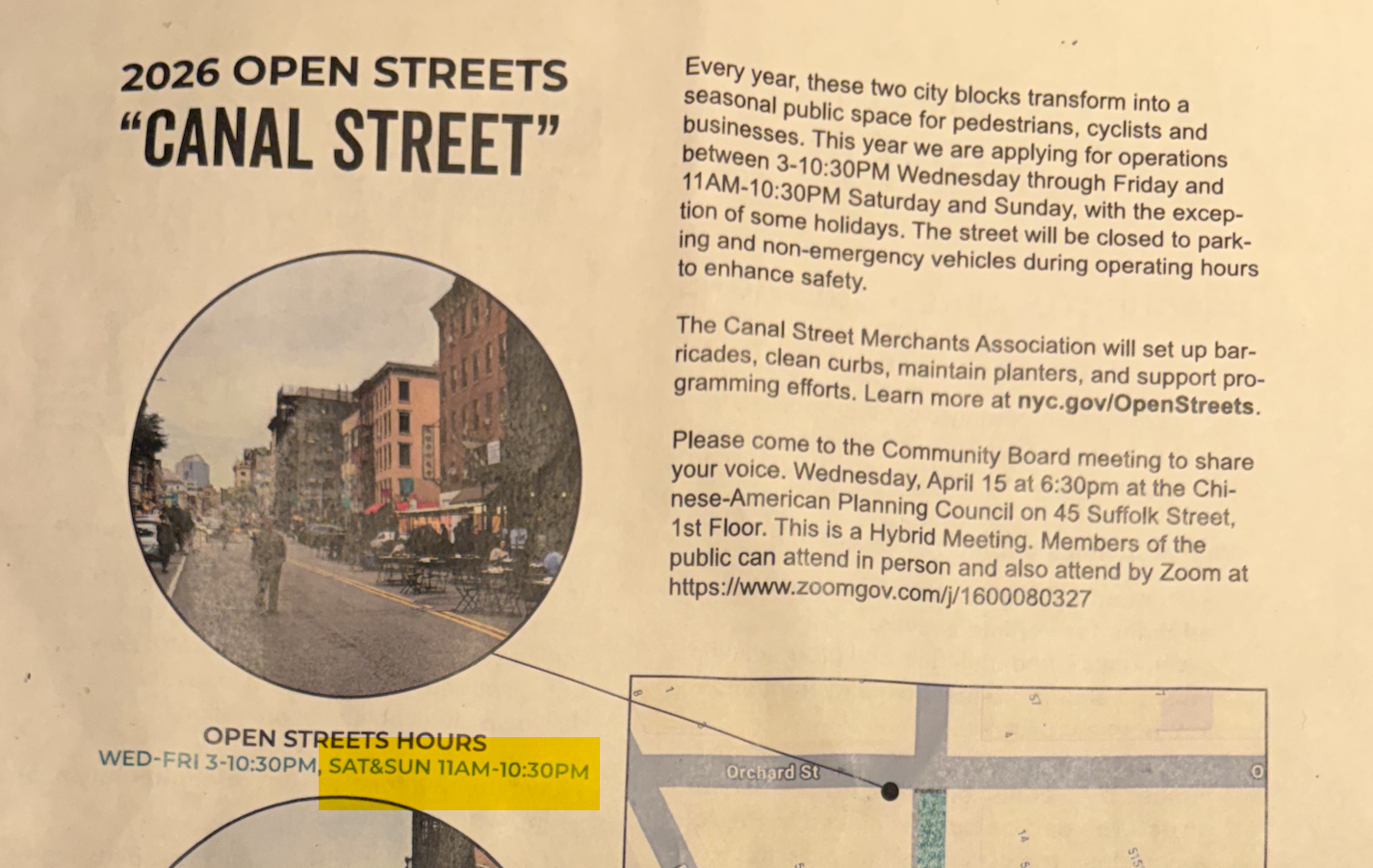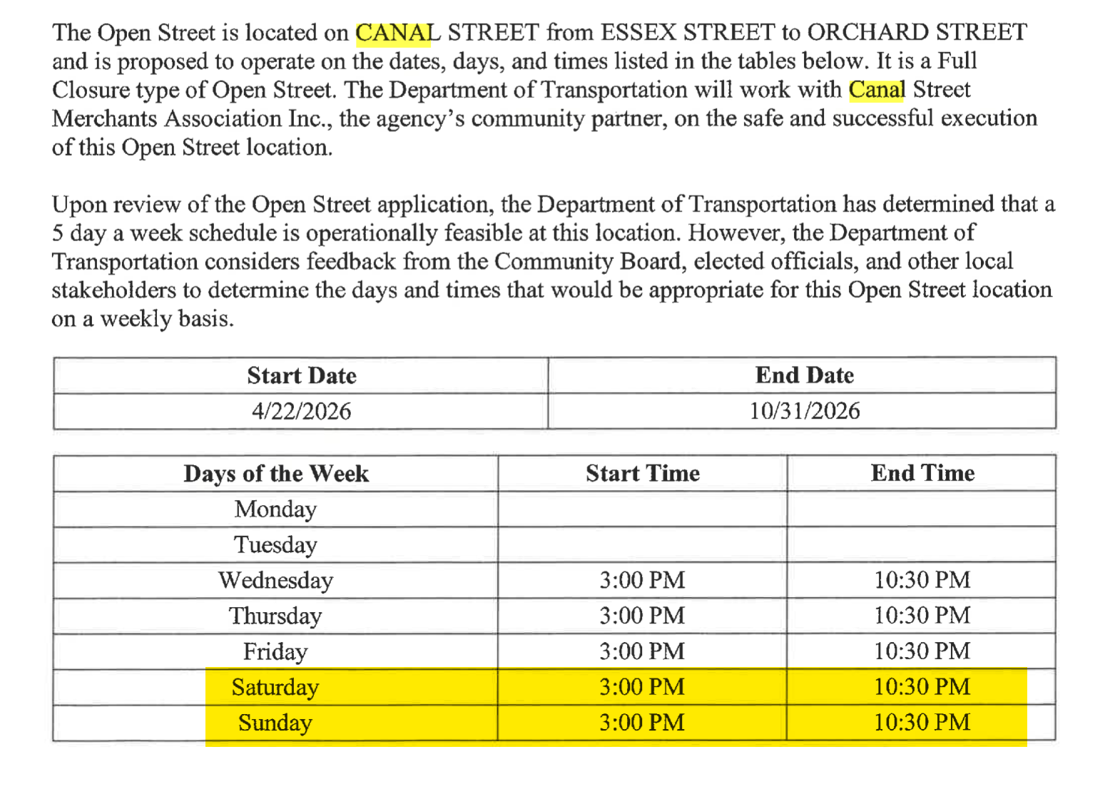 There is discrepancy in the notification sent to CB3 and the one that was posted around our neighborhood (see below images), once again causing confusion and alarm - as this would significantly expand operating hours that were already tamped down in response to operators past violations and laissez faire approach to DOT rules and safety regulations.The addition of +1 day a week , + 30min every night, +8 hours every weekend is concerning and will work against the successful harm reduction that DOT put in place in 2025 in direct response to mismanagement by Nialls Fallon & Canal Street Merchants.